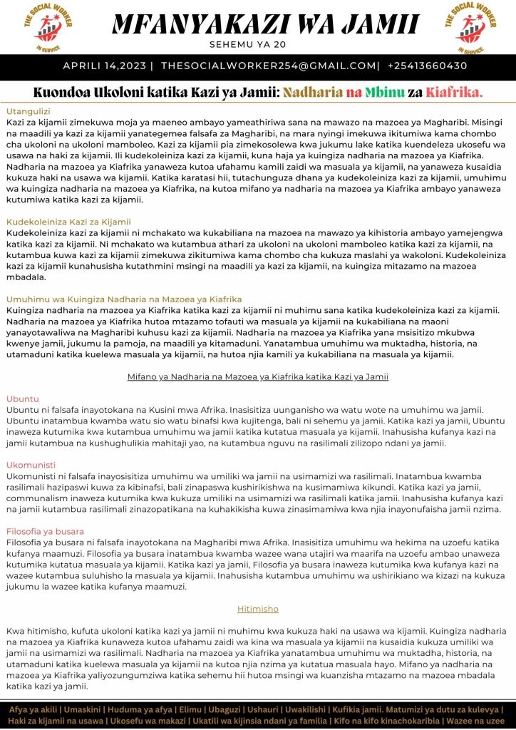 Kudekoloniza kazi ya kijamii, tunapaswa kuingiza nadharia na mazoea ya Kiafrika ambayo yanapingana na mtazamo wa kazi ya kijamii uliozidiwa na mtazamo wa Magharibi. Tunapaswa kutambua umuhimu wa jamii, jukumu la pamoja, na thamani za kitamaduni katika kuelewa masuala ya kijamii. Tunapaswa kukuza umiliki wa jamii na usimamizi wa rasilimali na kufanya kazi na wazee ili kutambua suluhisho za masuala ya kijamii. Tunapaswa kuchukua njia ya kina inayozingatia muktadha, historia, na utamaduni katika kushughulikia masuala ya kijamii.